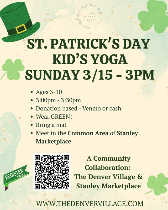 Celebrate the luck of the Irish with a fun, festive yoga session just for kids! Join us in the Stanley Marketplace Common Area for a 30-minute class designed to get little ones moving, breathing, and having a great time — all in the spirit of St. Paddy's Day.