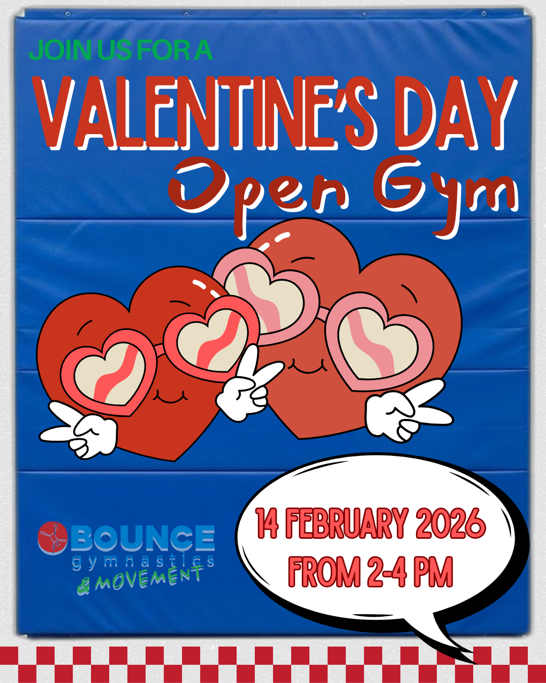 Children ages 6 to 12 will enjoy the full gym while supervised by Bounce Gymnastics experienced and helpful coaches. A piece of Valentine's candy is included for each child.