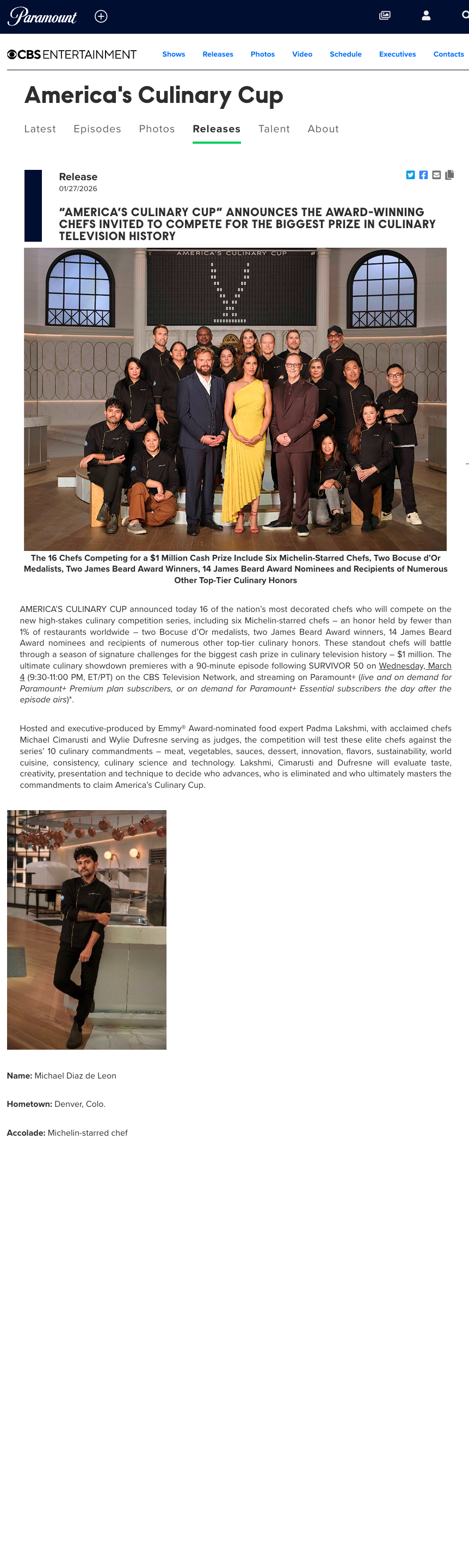 Chef Diaz de Leon joins an impressive lineup that includes six Michelin-starred chefs, two Bocuse d'Or medalists, two James Beard Award winners, and 14 James Beard Award nominees. The competition, premiering Wednesday, March 4 at 9:30 PM ET/PT on CBS, will test these elite chefs across 10 culinary commandments including meat, vegetables, sauces, dessert, and innovation.